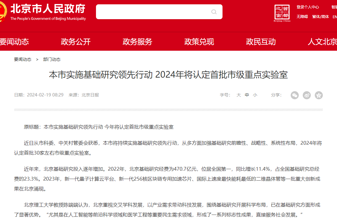 記者近日從市科委、中關村管委會獲悉,本市將持續實施基礎研究領先行動,從多方面加強基礎研究前瞻性、戰略性、系統性布局,今年將認定首批30家左右市級重點實驗室。 近年來,北京基礎研究投入逐年增加。2022年,北京基礎研究經費為470....